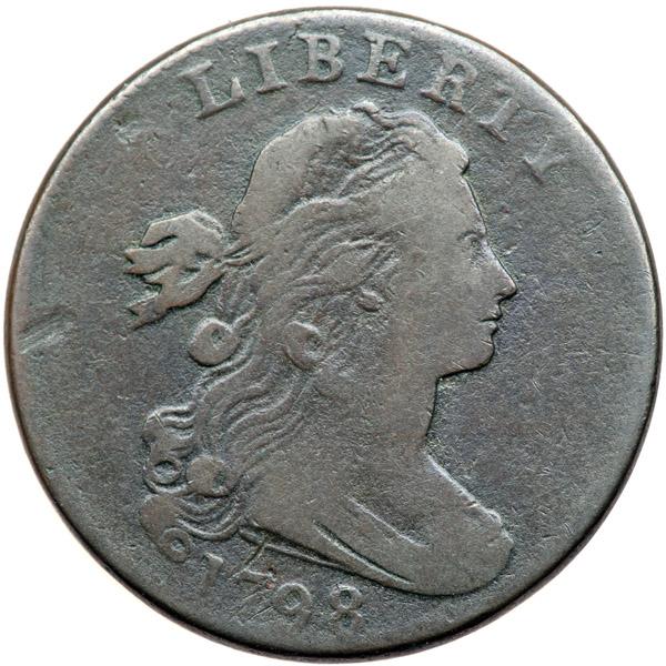 1798 S-184 R1 Style II Hair with Small 8 VG8. Rather glossy chocolate and olive brown. The surfaces are decent but not perfectly smooth showing extremely faint roughness in protected areas. No verdigris. The only marks are a couple shallow scrapes near the rim behind the portrait and a thin nick over the 7 in the date. The date and legends are complete and easily readable.