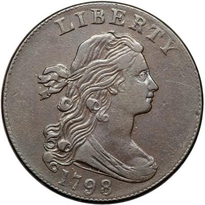 1798 S-184 R2- Style II Hair with Small 8. EF-40. Glossy chocolate and steel brown. Smooth, virtually flawless surfaces. The only marks, and they are microscopic, are a couple very faint hairline scratches in the field before the portrait and a small planchet chip at the dentils right of the chin. MDS, Breen state III, with several tiny die chips in the obverse fields. Removed from a PCGS slab graded EF45 (PCGS label included). DWH #2790.
