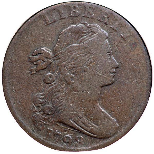 1798 S-185 R2 Small 8 with Style II Hair. ANACS graded VF-20. Glossy chocolate and olive brown. No roughness or verdigris, only trivial contact marks, none notable. The date and legends are complete and clear. MDS, Breen state III. Our grade is F12 with above average eye appeal for the grade.