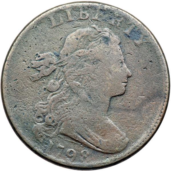1798 S-185 R2 Small 8 with Style II Hair G6. Slightly sharper but covered with very fine roughness that dulls the natural gloss. No notable verdigris or contact marks. Chocolate brown with a patch of darker toning at TY in LIBERTY. The date and legends are complete and clear.