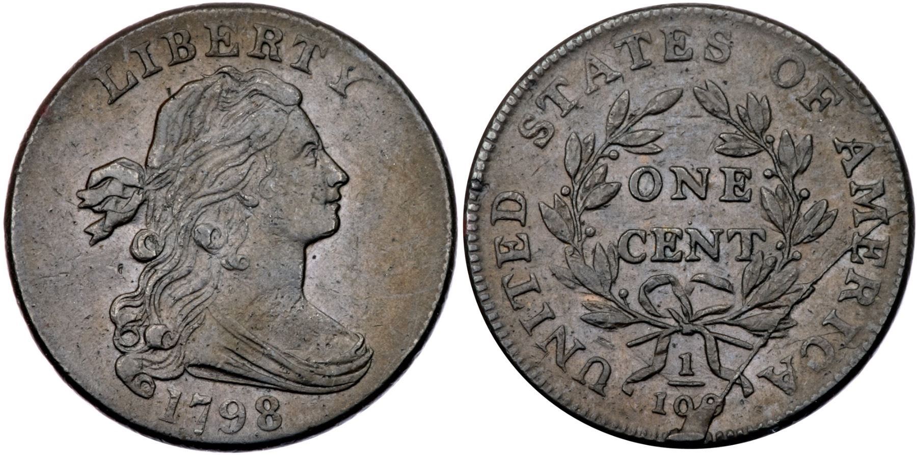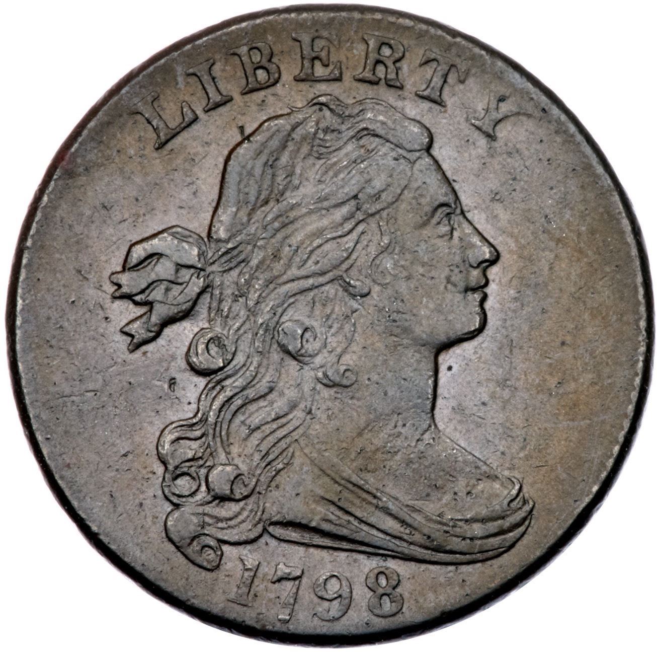 1798 S-186 R2 Small 8, Style II Hair VF35Frosty chocolate brown and steel. Lightly worn and attractive, but there are a few minor marks including a light diagonal nick close below the earlobe and a shallow planchet flake at the dentils over the D in UNITED. MDS, Breen state VII, with die cracks and clashmarks on both sides.Certificate Number: Pedigree: Ex Homer K. Downing-Dr. Hoffman-George Ramont (includes the Ramont collection envelope)