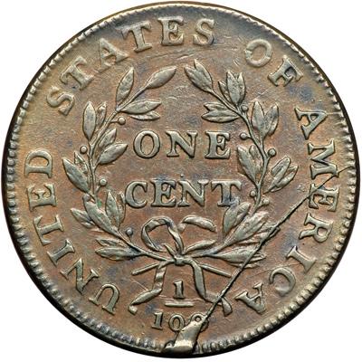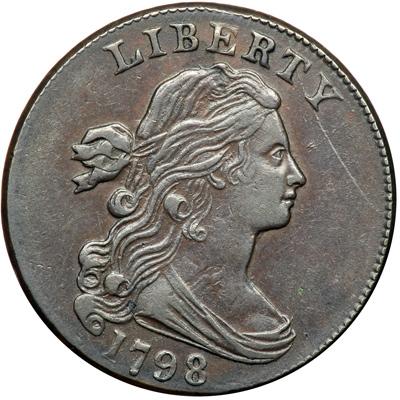 1798 S-186 R2 Style II Hair with Small 8. EF-40 Plus. Very close to EF45. Glossy chocolate and steel brown with lots of frosty lighter brown ands golden tan faded down from mint color in protected areas of the reverse. There are a couple very shallow low spots on the bottom of the neck (caused by debris on the die) and a tiny pinprick in the field close off the bust tip. A speck of greenish verdigris is barely visible in the field over the bust tip, and a few small spots of darker toning are scattered about the reverse. Excellent eye appeal in spite of the minor distractions. Nicely struck M-LDS, Breen state VII. The small cud break under the fraction touches the first 0 and covers at least half of the second 0 in the denominator with additional die cracks extending left from the fraction. Called EF45 and tied for CC#2 in the Bland census. Noyes says EF45 net EF40 and tied for CC#3, photo #27559. DWH #2792.