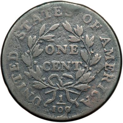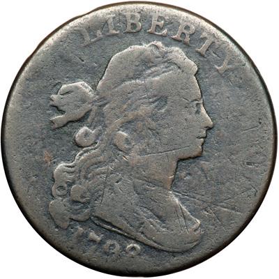 1798 S-186 R2 Style II Hair with Small 8. Good-5. Sharpness VG8 but there is some microscopic roughness in protected areas and a few light hairline scratches on the obverse, all blended nicely with the natural glossy dark olive and steel brown patina. The only other mark is a rim bruise at the second S in STATES. The date is clear, although the bottoms of the digits gently fade into the rim, and the legends are complete. MDS, Breen state V. A small cud break below the denominator reaches the 00. A humble little cent nestled into a fabulous collection. DWH #0201.