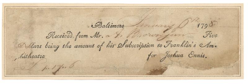 Partially Printed Document. One page, 7” x 2 1/2” as affixed to a slip of cream paper. Baltimore. January 6, 1798. The document reads: “ Received from Mr. A. Brown Junr. Five Dollars being the amount of his Subscription to Franklin’s Amphitheatre for Joshua Ennis.” Paper loss at lower left fill. Some toning. Overall Very Good.