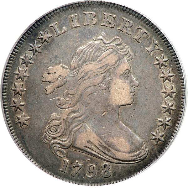 BB-102 is in the medium range of scarcity among silver dollars of 1798. Probably somewhere around 75 to 125 are known. The variety is one of only a few with an average grade below the VF level. A review of auction appearances demonstrates that here is a variety for which EF and AU are remarkable grades. Exactly why 1798 BB-102 should be so elusive in any grade above VF is one of those mysteries that makes collecting early dollars so interesting. The answer probably lies in the method of distribution (PCGS # 40019) .