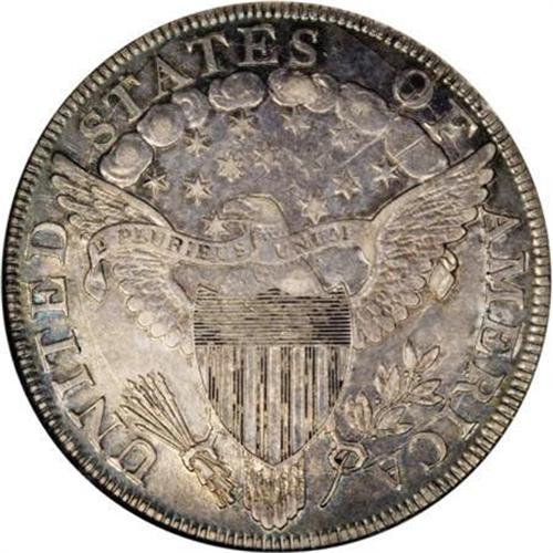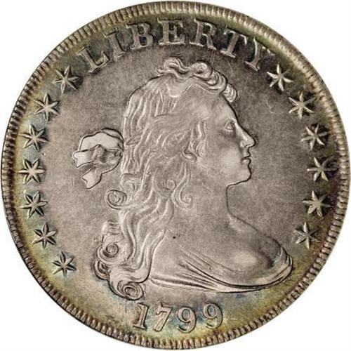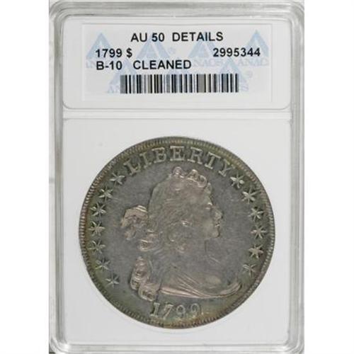 <B>1799 $1 7x6 Stars--Cleaned--ANACS. AU50 Details.</B></I> B-10, BB-163, R.2. Die State III. This obverse was used to strike several different die marriages. The upper side of the 1 in the date is a straight line. There is a leaf point between the left corner and left upright of the I in AMERICA, and the farthest arrow point is under the right upright of the N. This coin, despite the ANACS caution, offers much eye appeal and has retoned nicely in ice-blue and pinkish-gray hues. <BR><I>Ex: The Mount Vernon Collection, (Superior, 11/1976), lot 1274, per the accompanying envelope.</B></I><BR><BR><B>Coin Engraver:</B> Robert Scot<BR><BR><b>Shipping:</b> Coins & Currency (<a target="_blank" href="http://www.heritageauctions.com/common/shipping.php">view shipping information</a>\)