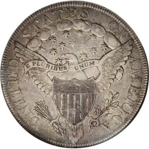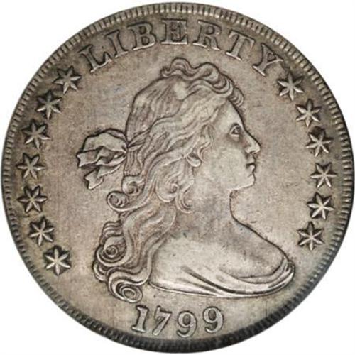 <B>1799 $1 7x6 Stars AU50 NGC.</B></I> B-12, BB-160, R.3. Two varieties, B-11 and B-12, are from the sans berry reverse die. The obverse of B-11 has the base of I below B, and B-12 has the bases of IB level. This is an attractive example with lustrous surfaces beneath natural gray-brown patina.<BR><BR><B>Coin Engraver:</B> Robert Scot<BR><BR><b>Shipping:</b> Coins & Currency (<a target="_blank" href="http://www.heritageauctions.com/common/shipping.php">view shipping information</a>)
