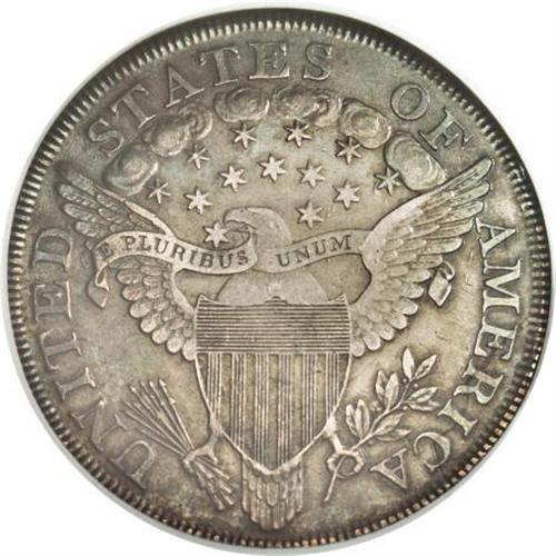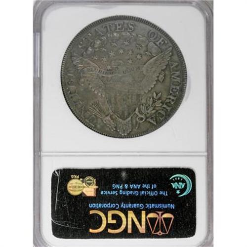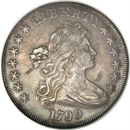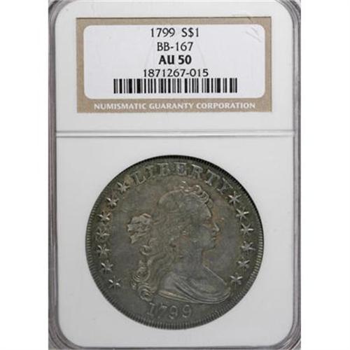<B>1799 $1 7x6 Stars AU50 NGC.</B></I> B-14, BB-167, R.3. Die State IV. The obverse has small die chips in the upper right field, called "tears" in Bowers' <I>Silver Dollar Encyclopedia. </B></I>The late die state with a thin die crack joining the tops of AME. Deep blue-gray toning is accompanied by traces of gold. A delightful example with smooth surfaces and excellent eye appeal. This piece just misses the Condition Census for B-14.<BR><I>From The Queller Family Collection of Silver Dollars.</B></I><BR><BR><b>Shipping:</b> Coins & Currency (<a target="_blank" href="http://www.heritageauctions.com/common/shipping.php">view shipping information</a>)