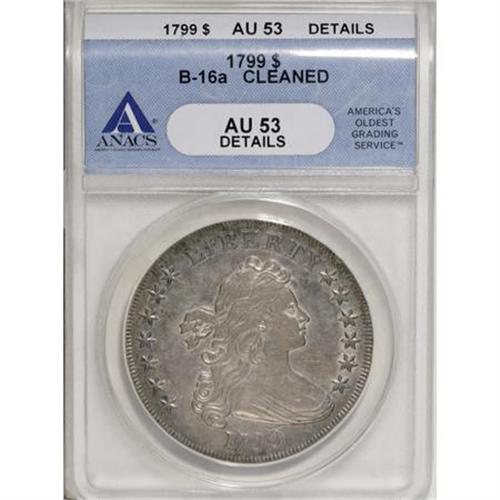 <B>1799 $1 7x6 Stars--Cleaned--ANACS. AU53 Details.</B></I> B-16a, BB-158, R.2. Bowers-Borckardt Die State III with prominent clash marks, "scarce." Mildly cleaned, as are the majority of Bust dollars, but this partly lustrous and well struck example will please even the jaded specialist. The borders display powder-blue toning, while the remainder of piece is faintly caramel-gold.<BR><I>From The Parker Lee III Collection.</B></I><BR><BR><B>Coin Engraver:</B> Robert Scot<BR><BR><b>Shipping:</b> Coins & Currency (<a target="_blank" href="http://www.heritageauctions.com/common/shipping.php">view shipping information</a>)