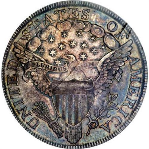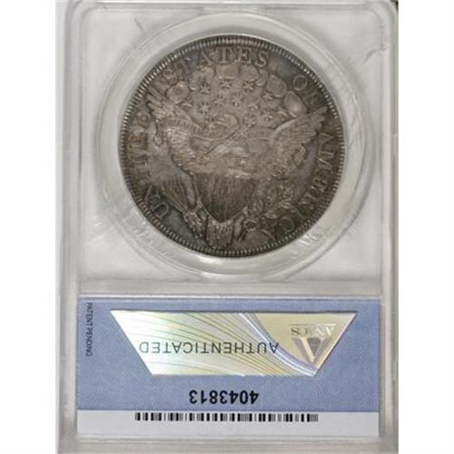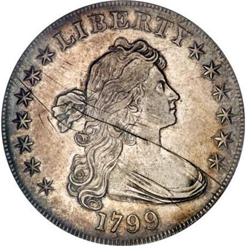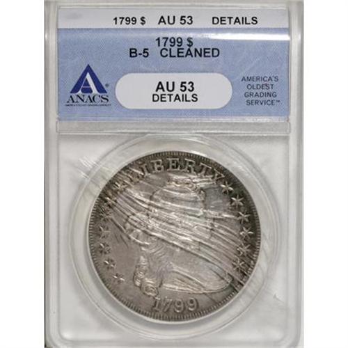 <B>1799 $1 7x6 Stars--Cleaned--ANACS. AU53 Details.</B></I> B-5, BB-157, R.2. Bowers-Borckardt Die State III, "scarce," with several prominent reverse die cracks. The central obverse is nearly brilliant, while the obverse field is light golden-tan and the obverse border offers sea-green. The reverse is evenly toned in medium chestnut-brown and cobalt-blue. Well struck with substantial luster, good eye appeal, and no mentionable marks.<BR><BR><B>Coin Engraver:</B> Robert Scot<BR><BR><b>Shipping:</b> Coins & Currency (<a target="_blank" href="http://www.heritageauctions.com/common/shipping.php">view shipping information</a>)