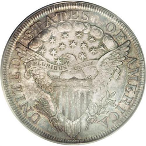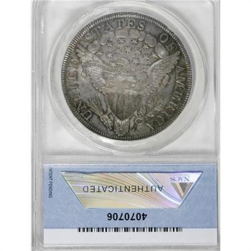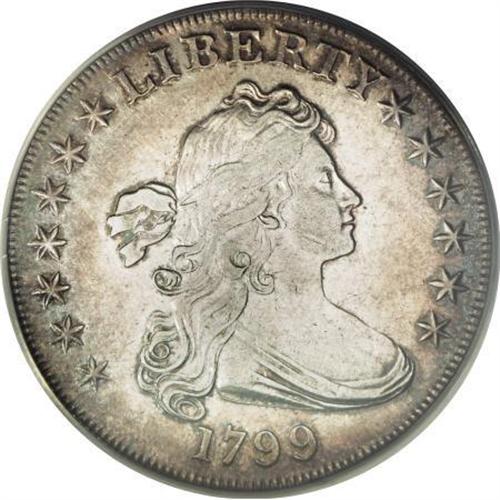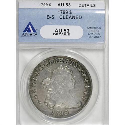 <B>1799 $1 7x6 Stars--Cleaned--ANACS. AU53 Details.</B></I> B-5, BB-157, R.2. Bowers-Borckardt Die State IV, "scarce." This bold representative displays substantial luster, particularly within the curls, clouds, wings, and legends. The obverse has light to medium golden-gray toning, and the reverse has medium to deep autumn-gold and forest-green patina. Faint hairlines are present, but no more than seen on most early dollars.<BR><BR><B>Coin Engraver:</B> Robert Scot<BR><BR><b>Shipping:</b> Coins & Currency (<a target="_blank" href="http://www.heritageauctions.com/common/shipping.php">view shipping information</a>)