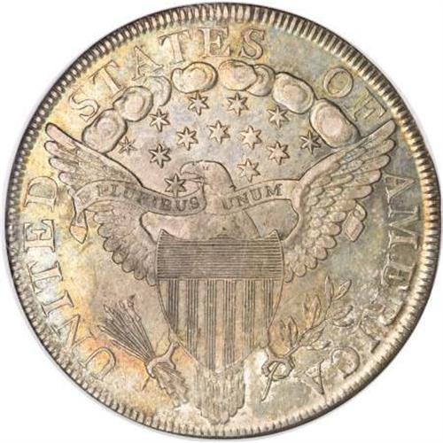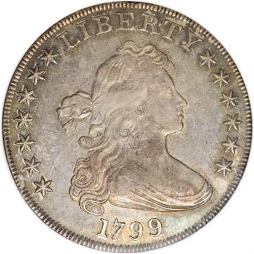 <B>1799 $1 7x6 Stars AU53 NGC.</B></I> B-12, BB-160, R.3. Bowers-Borckardt Die State I. A "No Berries" variety, due to a lapped reverse die. Orange, sky-blue, gold, and steel-gray endow this generally lustrous example. A small number of hair-thin marks on the field above the arrows, but a generally pleasing piece with only minimal high point wear.<BR><BR><B>Coin Engraver:</B> Robert Scot<BR><BR><b>Shipping:</b> Coins & Currency (<a target="_blank" href="http://www.heritageauctions.com/common/shipping.php">view shipping information</a>)