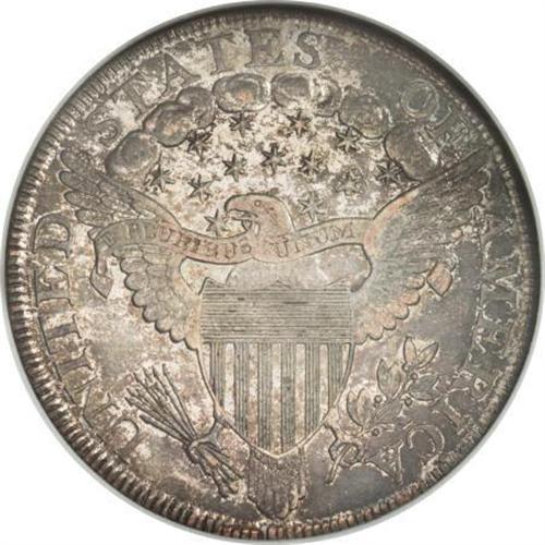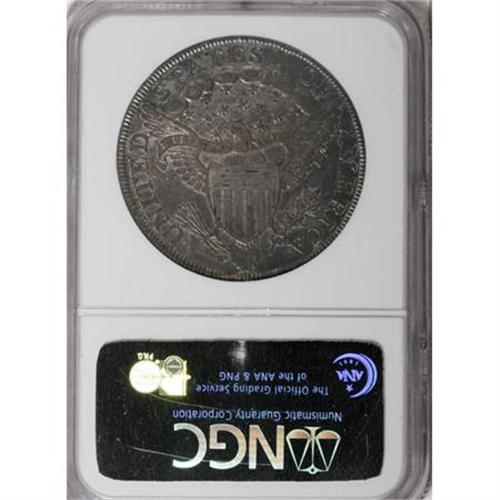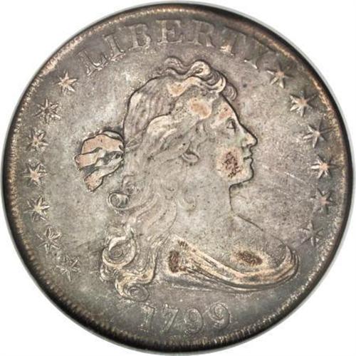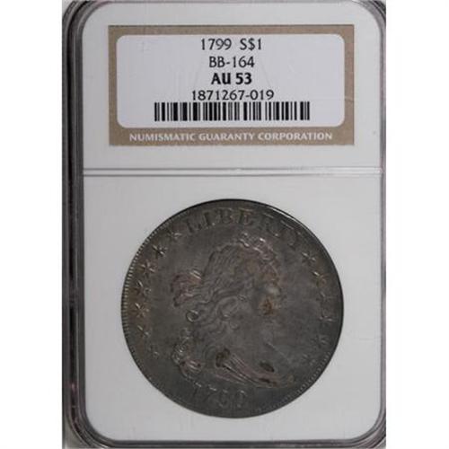 <B>1799 $1 7x6 Stars AU53 NGC.</B></I> B-17, BB-164, R.2. Die State II.<B> </B></I>The early die state is seldom seen, accounting for fewer than 5% of the surviving population of this variety, according to Dave Bowers. Die State II is scarce as well, as on the present piece, which shows a reverse crack extending from the right side of U through NITE, but not quite yet touching the D. <BR> The obverse displays deep gray-gold patina with darker highpoints, while the reverse is more enticing, with some lustrous silvery areas complementing the pink and blue mottled shadings.<BR><I>Ex: Stack's, privately.</B></I><BR><I>From The Queller Family Collection of Silver Dollars.</B></I><BR><BR><b>Shipping:</b> Coins & Currency (<a target="_blank" href="http://www.heritageauctions.com/common/shipping.php">view shipping information</a>)