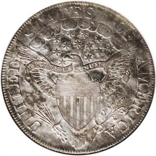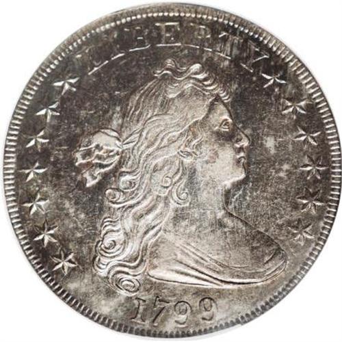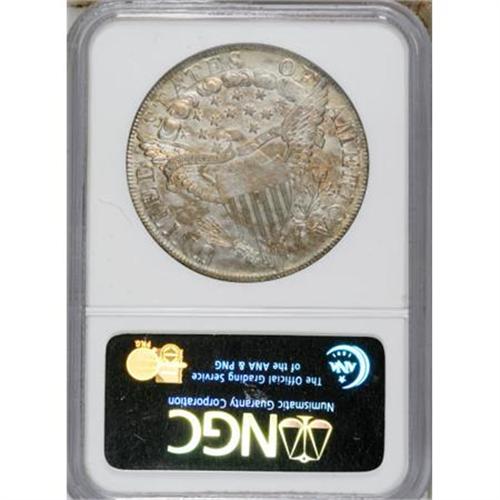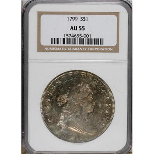 <B>1799 $1 7x6 Stars AU55 NGC.</B></I> B-11, BB-161, R.3. A ''No Berries'' variety, and further distinguished by a broken U in UNITED and a die crack past the D in UNITED. On the obverse, the base of the I in LIBERTY is slightly below the adjacent B. While the obverse die had been relapped (David Bowers, 1993), heavy clash marks ("waves" from the reverse clouds) eventually reappeared, and are visible on the current example. Delicate cobalt-blue, golden-brown, and lavender patination visits bright surfaces that exhibit well defined design features. Vertical adjustment marks crossing Liberty's portrait co-exist with some unobtrusive circulation marks.<BR><BR><b>Shipping:</b> Coins & Currency (<a target="_blank" href="http://www.heritageauctions.com/common/shipping.php">view shipping information</a>)