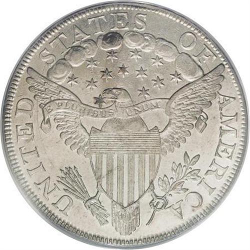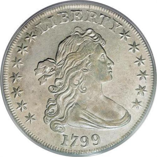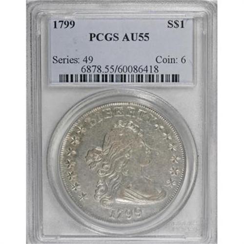 <B>1799 $1 7x6 Stars AU55 PCGS.</B></I> B-10, BB-163, R.1. Die State III. Hints of tan patina visit the highpoints of this attractive and sharply struck Bust dollar. The cheek, bust truncation, and breast feathers have only light friction, and the surfaces are refreshingly unmarked. The reverse rim has a slight depression at 12 o'clock, likely as made although the encapsulation prevents a thorough examination. Considerable satiny luster glimmers throughout the legends and devices.<BR><BR><B>Coin Engraver:</B> Robert Scot<BR><BR><b>Shipping:</b> Coins & Currency (<a target="_blank" href="http://www.heritageauctions.com/common/shipping.php">view shipping information</a>)