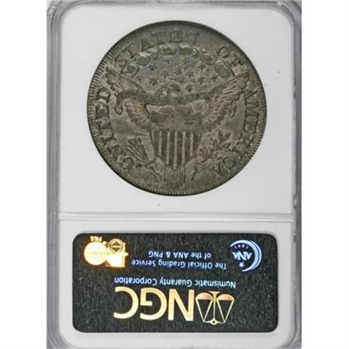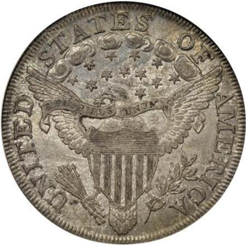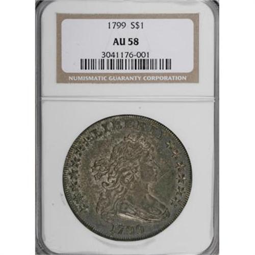 <B>1799 $1 7x6 Stars AU58 NGC.</B></I> B-9, BB-166, R.1. Bowers-Borckardt Die State IV. Obverse die crack through Liberty's bust extends to star 10 and also downward to first 9 in the date. Deep cobalt-blue and olive-drab toning covers both sides. Well struck with very little highpoint wear and few blemishes evident on either side. Some faint adjustment marks (as struck) are noted just above the eagle's head. <BR><BR><B>Coin Engraver:</B> Robert Scot<BR><BR><b>Shipping:</b> Coins & Currency (<a target="_blank" href="http://www.heritageauctions.com/common/shipping.php">view shipping information</a>)