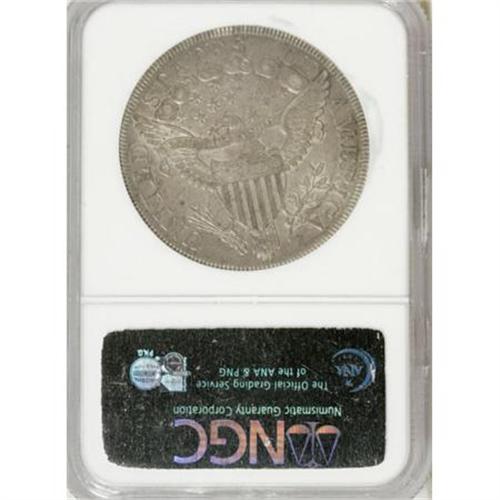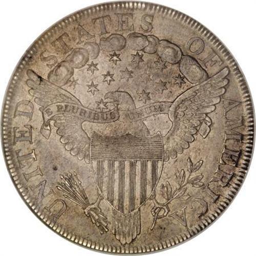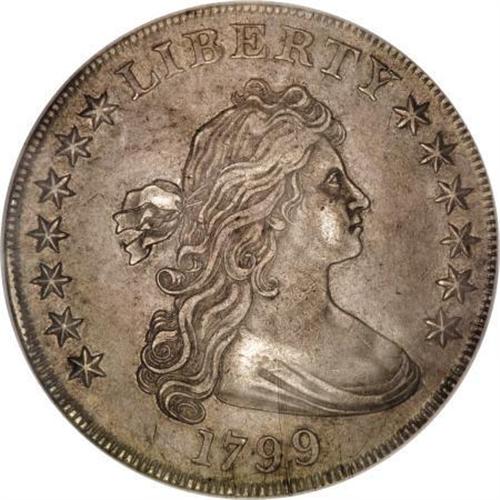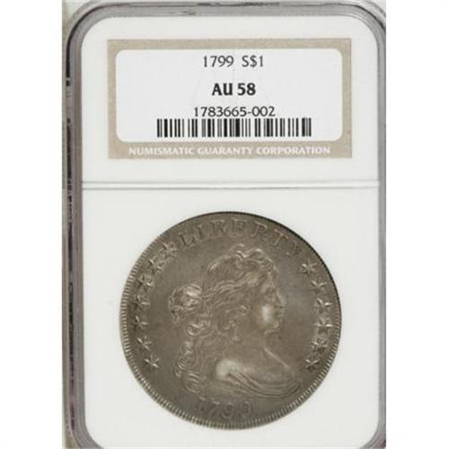 <B>1799 $1 7x6 Stars AU58 NGC.</B></I> B-12, BB-160, R.3. Bowers-Borckardt Die State III. The "No Berries" reverse. Berries, or fruits, were once present on the olive branch of the reverse die (as seen on BB-158 and BB-159) but have been lapped away, as made. The dies are rotated a few degrees counterclockwise. Bowers estimates between 35 to 70 examples of BB-160 have survived in all AU grades.<BR> This is an impressive near-Mint example that has only minor wear on the cheek, shoulder, and ribbon. Rich dove-gray toning embraces the unblemished surfaces. Luster shimmers across most of the reverse, and also fills Liberty's hair and the obverse margin. A significant opportunity for the alert specialist.<BR><BR><B>Coin Engraver:</B> Robert Scot<BR><BR><b>Shipping:</b> Coins & Currency (<a target="_blank" href="http://www.heritageauctions.com/common/shipping.php">view shipping information</a>)