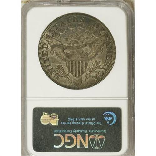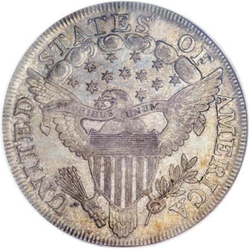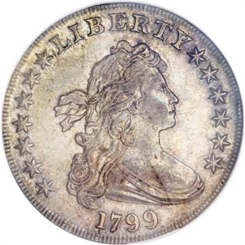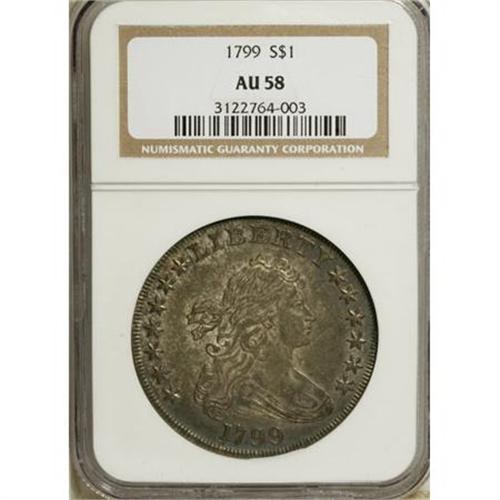 <B>1799 $1 7x6 Stars AU58 NGC.</B></I> B-9, BB-166, R.1. Die State V. The obverse has prominent die cracks in the field before Liberty's face. The prominent "apostrophe" break following the final S is diagnostic for the die marriage. A splendid near-Mint example, this piece is outside the Condition Census, but probably among the top dozen examples known. The surfaces have a lovely mix of olive, blue, gold, and steel toning over subdued mint frost. Both sides are boldly defined with only faint traces of highpoint wear.<BR><I>From The Queller Family Collection of Silver Dollars.</B></I><BR><BR><b>Shipping:</b> Coins & Currency (<a target="_blank" href="http://www.heritageauctions.com/common/shipping.php">view shipping information</a>)