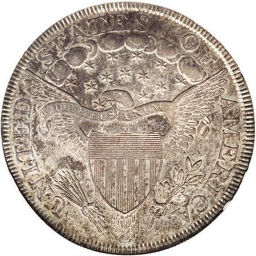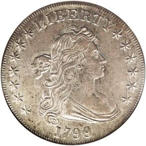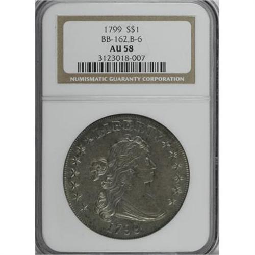 <B>1799 $1 7x6 Stars AU58 NGC.</B></I> B-6, BB-162, R.4. Die State III. This die marriage is one of the popular 1799 7x6 Stars pairings, but this particular mating is considerably rarer than some of the other more common ones, such as the B-5, BB-157. The obverse here features the usual light "wave" clash marks seen above the date, with star 1 small and thin. The so-called "cobweb" clash marks under the chin are unseen. The reverse shows the A in STATES touching a cloud. This is the usually seen die state, with cracks more numerous on the reverse. The present specimen is not only just a hair's breadth away from Mint State, it also boasts lovely gray-gold and pink-gold patina on both sides, with premium appeal and somewhat prooflike surfaces.<BR><BR><B>Coin Engraver:</B> Robert Scot<BR><BR><b>Shipping:</b> Coins & Currency (<a target="_blank" href="http://www.heritageauctions.com/common/shipping.php">view shipping information</a>)