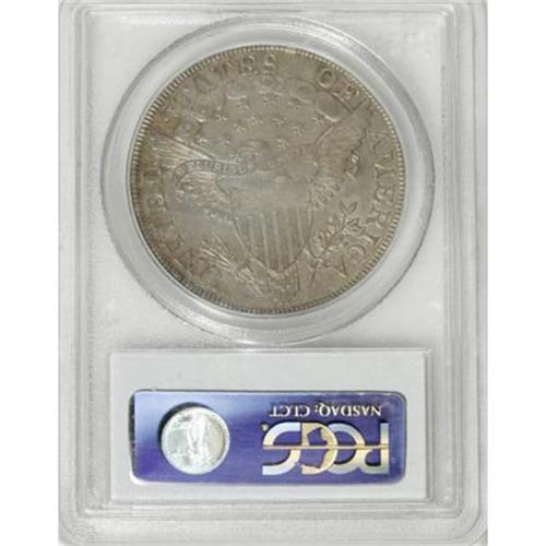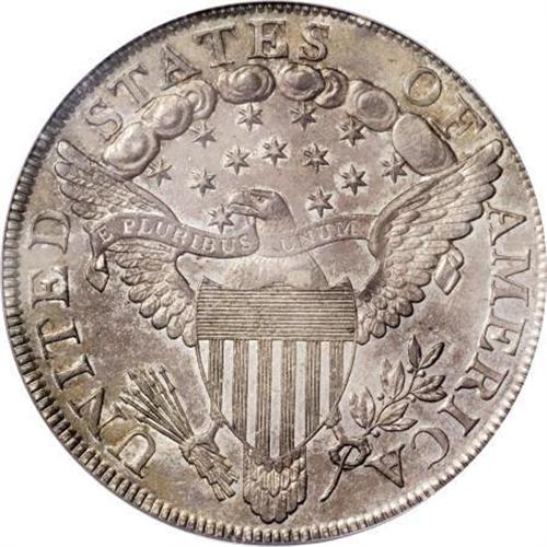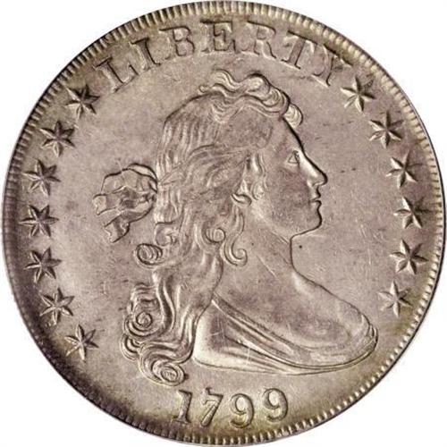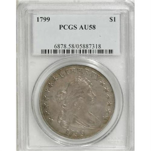 <B>1799 $1 7x6 Stars AU58 PCGS.</B></I> B-10, BB-163, R.2. Obverse Die State II, Reverse Die State I. A die lump in the drapery above the first 9 in the date, and the farthest arrow point under the right upright of N in UNITED confirms the variety. The AU58 example offered here possibly represents an unreported die state; an obverse crack connects stars 11 through 13 (Die State II), the reverse is perfect (Die State I). The die state combination does not appear in the 1993 Bowers-Borckardt classification. The die state is earlier than Reiver's a, which has the reverse crack through the right (facing) wingtip. The present piece is the only "perfect reverse" example known.<BR> Attractive golden-gray surfaces display a good amount of luster, and are remarkably clean for a large silver dollar that has seen some circulation. The design elements are well centered on the planchet, and exhibit sharp definition. The dentilation is relatively strong on both sides. A truly pleasing coin that is sure to elicit spirited bidding among early silver dollar aficionados.<BR><BR><B>Coin Engraver:</B> Robert Scot<BR><BR><b>Shipping:</b> Coins & Currency (<a target="_blank" href="http://www.heritageauctions.com/common/shipping.php">view shipping information</a>)