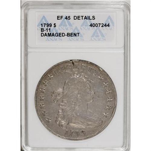 <B>1799 $1 7x6 Stars--Damaged, Bent--ANACS. XF45 Details.</B></I> B-11, BB-161, R.3. A ''No Berries'' variety, and further distinguished by a broken U in UNITED and a die crack past the D in UNITED. On the obverse, the base of the I in LIBERTY is slightly below the adjacent B. Some small punch marks are visible on each side, as are rim bruises. The bending does not appear to be all that severe. Nicely detailed, with light golden-gray patina.<BR><BR><B>Coin Engraver:</B> Robert Scot<BR><BR><b>Shipping:</b> Coins & Currency (<a target="_blank" href="http://www.heritageauctions.com/common/shipping.php">view shipping information</a>)