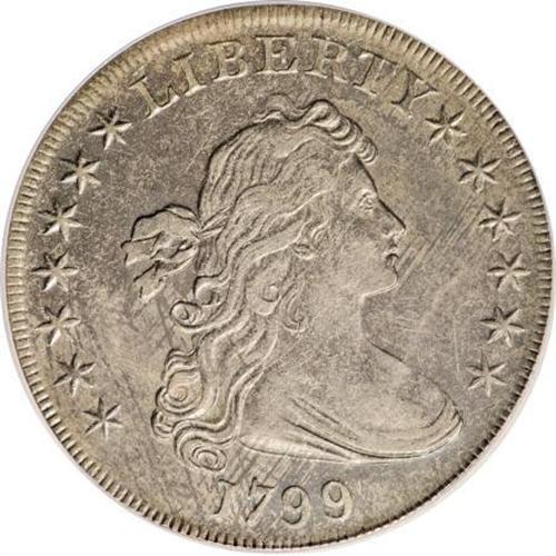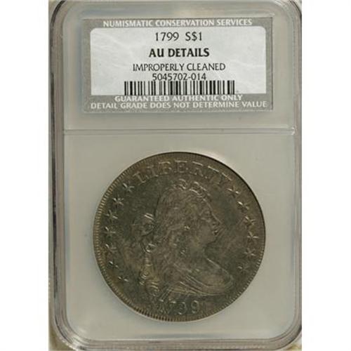 <B>1799 $1 7x6 Stars--Improperly Cleaned--NCS. AU Details.</B></I> B-10, BB-163, R.2. This is the scarce early die state with an extremely faint die crack connecting stars 11 through 13. The reverse is perfect with no trace of any die cracks. Retoned with attractive olive and steel surfaces. Smooth surfaces retain traces of luster on each side.<BR><I>From The Queller Family Collection of Silver Dollars.</B></I><BR><BR><b>Shipping:</b> Coins & Currency (<a target="_blank" href="http://www.heritageauctions.com/common/shipping.php">view shipping information</a>)