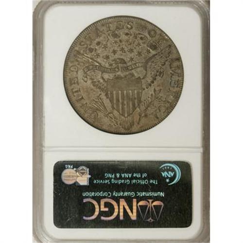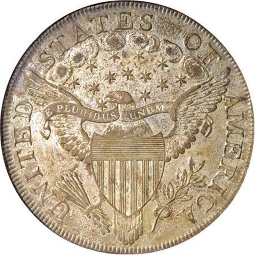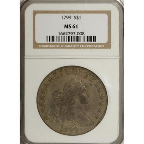 <B>1799 $1 7x6 Stars MS61 NGC.</B></I> <B>1799 S$1 MS61 NGC.</B></I> B-9, BB-166, Die State I. An exceedingly rare and significant early die state of Bolender-9, known by specialists as the Apostrophe Variety, named for the die crack from the border just after the final S of STATES into the field. Usually identified by this feature; however, this is Die State I in Dave Bowers' <I>Silver Dollar Encyclopedia, </B></I> with no evidence of either the reverse crack (apostrophe) after the S of STATES, or the typically seen die break beneath the 1 in the date. Luster glows beneath dusky dark brown color and darker steel toning. A tiny rim bump is visible on the obverse at 5 o'clock, but this only affects a portion of four dentils. This is a spectacular early Silver Dollar in full Mint State preservation, and one that was "never seen" by either Bowers or Borckardt.<BR><BR><B>Coin Engraver:</B> Robert Scot<BR><BR><b>Shipping:</b> Coins & Currency (<a target="_blank" href="http://www.heritageauctions.com/common/shipping.php">view shipping information</a>\)