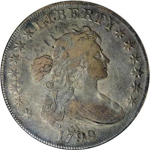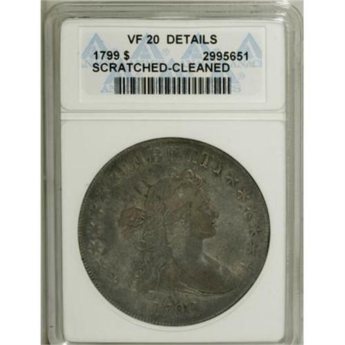 <B>1799 $1 7x6 Stars--Scratched, Cleaned--ANACS. VF20 Details.</B></I> B-10, BB-163, R.2. Die State IV. The advanced die state of the reverse die is obvious, although there are numerous old pinscratches, mostly but not all on the reverse, that make the task of identifying die cracks more difficult. An old cleaning has left the surfaces a dullish blue-gray, but this is nonetheless an interesting coin in a rare die state. <BR><BR><B>Coin Engraver:</B> Robert Scot<BR><BR><b>Shipping:</b> Coins & Currency (<a target="_blank" href="http://www.heritageauctions.com/common/shipping.php">view shipping information</a>\)