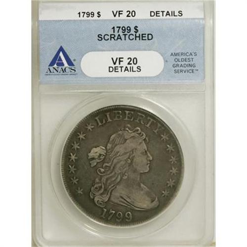 <B>1799 $1 7x6 Stars--Scratched--ANACS. VF20 Details.</B></I> B-17, BB-164, R.2. Bowers-Borckardt Die State V. The left obverse field has four faded straight scratches, and the lower half of the portrait has several pinscratches that form geometric patterns. Dusky gray toning helps conceal the abrasions.<BR><BR><B>Coin Engraver:</B> Robert Scot<BR><BR><b>Shipping:</b> Coins & Currency (<a target="_blank" href="http://www.heritageauctions.com/common/shipping.php">view shipping information</a>)