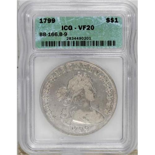 <B>1799 $1 7x6 Stars VF20 ICG.</B></I> B-9, BB-166, R.1. A moderately worn example of this available issue that shows ice-blue and violet toning over silver-gray surfaces. Small dots of charcoal patina pepper the reverse.<BR><BR><B>Coin Engraver:</B> Robert Scot<BR><BR><b>Shipping:</b> Coins & Currency (<a target="_blank" href="http://www.heritageauctions.com/common/shipping.php">view shipping information</a>)