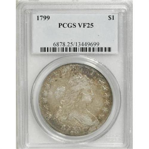<B>1799 $1 7x6 Stars VF25 PCGS.</B></I> B-5, BB-157. Die State II, as typically encountered with this variety. Ample luster on both sides of this early dollar beckons to a higher grade. Orange-gold iridescence beams from within the protected recesses on the obverse, while the reverse displays gunmetal-gray blended with rose coloration.<BR><BR><B>Coin Engraver:</B> Robert Scot<BR><BR><b>Shipping:</b> Coins & Currency (<a target="_blank" href="http://www.heritageauctions.com/common/shipping.php">view shipping information</a>)