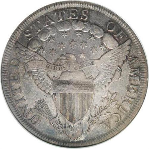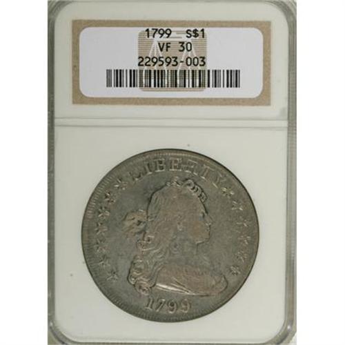 <B>1799 $1 7x6 Stars VF30 NGC.</B></I> B-5, BB-157, R.2. Bowers-Borckardt Die State III. Aqua-blue and olive-gray tones envelop this well-defined early dollar, which retains glimpses of luster within the wings and other protected areas. No marks are consequential, and the only hint of a rim ding is on the obverse at 2 o'clock.<BR><BR><B>Coin Engraver:</B> Robert Scot<BR><BR><b>Shipping:</b> Coins & Currency (<a target="_blank" href="http://www.heritageauctions.com/common/shipping.php">view shipping information</a>)