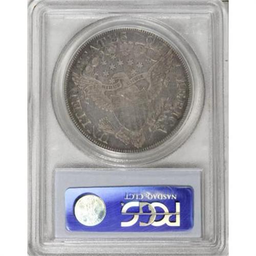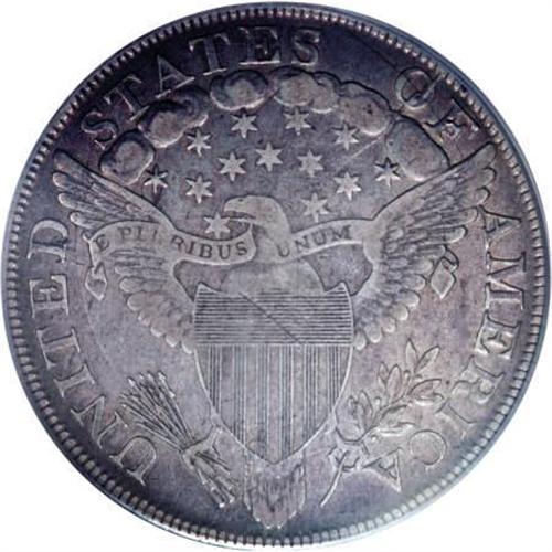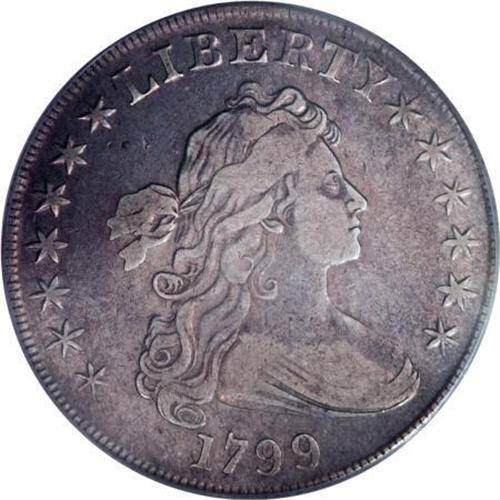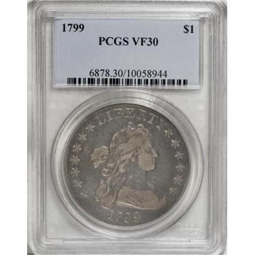 <B>1799 $1 7x6 Stars VF30 PCGS.</B></I> B-10, BB-163, R.2. A die lump appears in the drapery above the first 9 in the date, and a faint die crack crosses the eagle's right (facing) wing. Both sides of this moderately worn but pleasing example display rich gold, violet, and peach toning. The obverse displays only a handful of scattered digs, though a thin diagonal abrasion crosses the chief azure of the shield.<BR><BR><B>Coin Engraver:</B> Robert Scot<BR><BR><b>Shipping:</b> Coins & Currency (<a target="_blank" href="http://www.heritageauctions.com/common/shipping.php">view shipping information</a>\)