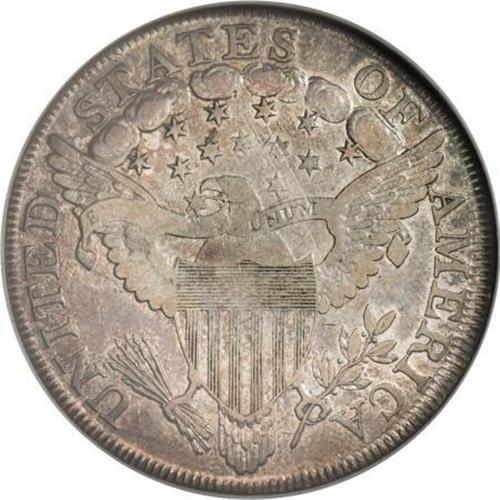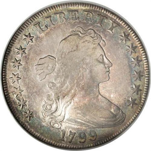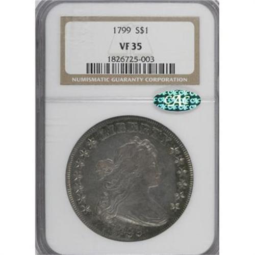 <B>1799 $1 7x6 Stars VF35 NGC. CAC.</B></I> B-19, BB-155, R.5. Die State IV. This piece is in the latest die state--one that is rare--observed for the variety, one apparently undescribed by Bolender, despite his having a specimen of the die state in his own collection. In this latest die state, a crack extends on the obverse from star 2 to the hair, and on the reverse there is a crack from the right side of the D in UNITED. <BR> This lovely example offers smooth deep gray surfaces complementing peripheral iridescence and a light wash of golden color. A few light adjustment marks are evident near the central reverse.<BR><I>From The Queller Family Collection of Silver Dollars.</B></I><BR><BR><b>Shipping:</b> Coins & Currency (<a target="_blank" href="http://www.heritageauctions.com/common/shipping.php">view shipping information</a>)