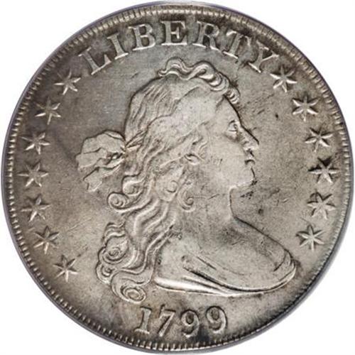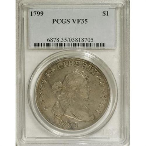 <B>1799 $1 7x6 Stars VF35 PCGS.</B></I> B-10, BB-163, R.2. Bowers-Borckardt Die State IV, which Bowers called a "rare die state," adding, "The die could not have survived long beyond this point." Primarily pearl-gray, with glimpses of deeper steel-gray near the rims. Free from mentionable marks, and a charming representative of the terminal die state.<BR><BR><b>Shipping:</b> Coins & Currency (<a target="_blank" href="http://www.heritageauctions.com/common/shipping.php">view shipping information</a>)