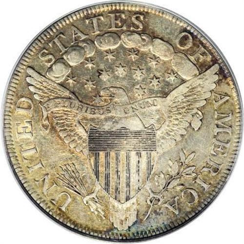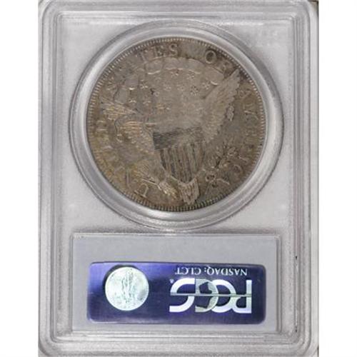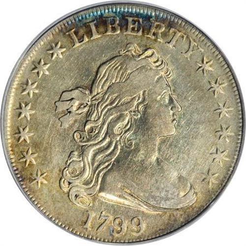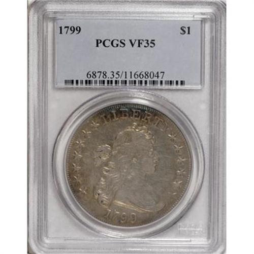 <B>1799 $1 7x6 Stars VF35 PCGS.</B></I> B-10, BB-163, R.2. Golden-brown, electric-blue, and plum-red graces this impressively detailed Heraldic Eagle dollar. Traces of luster fill pockets of the design, such as Liberty's hair and the eagle's wings. The reverse field has a few faint marks, but the eye appeal and sharpness is superior for the grade.<BR><BR><B>Coin Engraver:</B> Robert Scot<BR><BR><b>Shipping:</b> Coins & Currency (<a target="_blank" href="http://www.heritageauctions.com/common/shipping.php">view shipping information</a>)