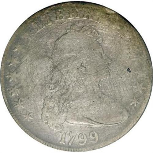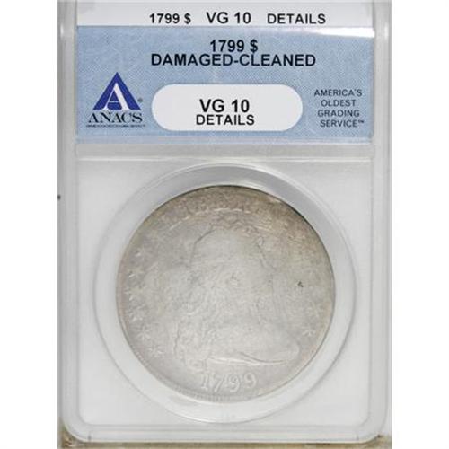 <B>1799 $1 7x6 Stars--Cleaned, Damaged--ANACS. VG10 Details.</B></I> NGC Census: (25/1320). PCGS Population (70/2002). Mintage: 423,515. Numismedia Wsl. Price for NGC/PCGS coin in VG10: $905. (#6878)<BR><BR><B>Coin Engraver:</B> Robert Scot<BR><BR><b>Shipping:</b> Coins & Currency (<a target="_blank" href="http://www.heritageauctions.com/common/shipping.php">view shipping information</a>)
