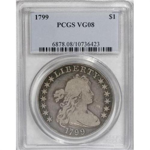 <B>1799 $1 7x6 Stars VG8 PCGS.</B></I> B-9, BB-161, R.1. Bowers-Borckardt Die State II-III. The "Apostrophe" variety with a die break after the second S in STATES. The pearl-gray centers are framed by ebony-gray. Worn near the eagle's head, although all reverse stars are at least faintly visible.<BR><BR><b>Shipping:</b> Coins & Currency (<a target="_blank" href="http://www.heritageauctions.com/common/shipping.php">view shipping information</a>)