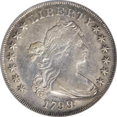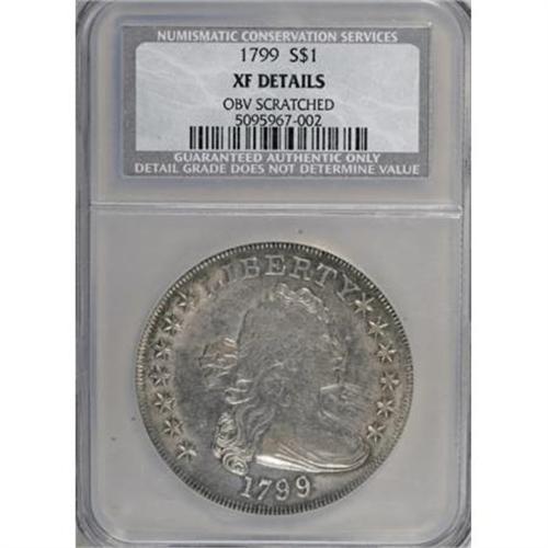 <B>1799 $1 7x6 Stars--Obverse Scratched--NCS. XF Details.</B></I> B-14, BB-167, R.3. Bowers-Borckardt Die State IV. A bold representative of this popular early large silver type. The right obverse field is pinscratched, and the left obverse field is slightly bright. Faintly granular gray streaks cross the upper left reverse. Still desirable, since luster beckons from the devices and margins. <BR><BR><B>Coin Engraver:</B> Robert Scot<BR><BR><b>Shipping:</b> Coins & Currency (<a target="_blank" href="http://www.heritageauctions.com/common/shipping.php">view shipping information</a>)