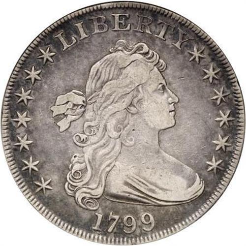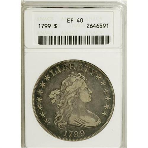 <B>1799 $1 7x6 Stars XF40 ANACS.</B></I> B-7, BB-156, R.4. Bowers-Borckardt Die State II to III. An attractively detailed Bust dollar with deep gunmetal-gray fields and lighter cream-gray devices. E PLURIBUS UNUM is fully legible, and the eagle's wings and Liberty's hair are exquisitely defined. A few faint hairlines are found on the right obverse field and above the eagle.<BR><BR><B>Coin Engraver:</B> Robert Scot<BR><BR><b>Shipping:</b> Coins & Currency (<a target="_blank" href="http://www.heritageauctions.com/common/shipping.php">view shipping information</a>\)