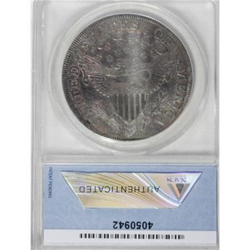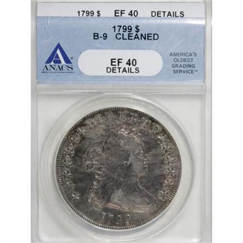 <B>1799 $1 7x6 Stars--Cleaned--ANACS. XF40 Details.</B></I> B-9, BB-166, R.1. A die crack from base of 1 in date to rim, and a die crack after the last S in STATES confirms the variety (often referred to as the "Apostrophe" variety). Fine hairlines show on the silver-brown surfaces under magnification, and a shallow scratch is visible on the reverse. Nice details for the grade.<BR><BR><B>Coin Engraver:</B> Robert Scot<BR><BR><b>Shipping:</b> Coins & Currency (<a target="_blank" href="http://www.heritageauctions.com/common/shipping.php">view shipping information</a>)