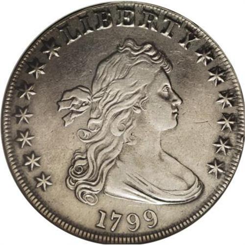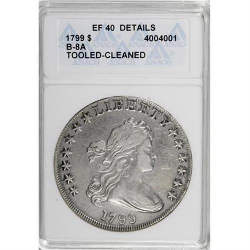 <B>1799 $1 7x6 Stars--Tooled, Cleaned--ANACS. XF40 Details.</B></I> B-8A, BB-165, R.3. No tooling is obvious, although the pearl-gray fields are slightly bright and a cluster of faded marks is present near obverse star 11. Some luster remains within the hair, shield, and plumage. A bold example of this impressive early silver type.<BR><I>From The Diemer L. Fife Collection.</B></I><BR><BR><B>Coin Engraver:</B> Robert Scot<BR><BR><b>Shipping:</b> Coins & Currency (<a target="_blank" href="http://www.heritageauctions.com/common/shipping.php">view shipping information</a>)