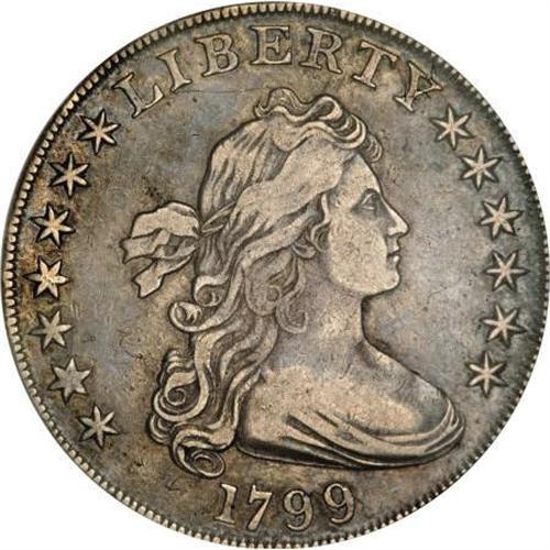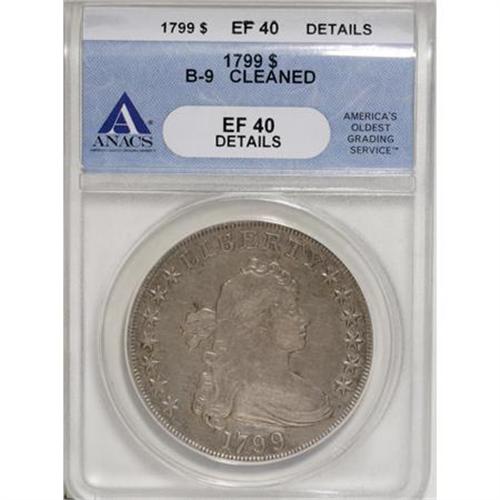 <B>1799 $1 7x6 Stars--Cleaned--ANACS. XF40 Details.</B></I> B-9, BB-166, R.1. Bowers-Borckardt Die State II, "scarce." The "Apostrophe" variety, named after a thin vertical die crack after the second S in STATES. This pearl-gray and steel-blue dollar provides glimmers of mint luster in design recesses. Faintly hairlined, and the fields have occasional marks.<BR><I>From The Parker Lee III Collection.</B></I><BR><BR><B>Coin Engraver:</B> Robert Scot<BR><BR><b>Shipping:</b> Coins & Currency (<a target="_blank" href="http://www.heritageauctions.com/common/shipping.php">view shipping information</a>)