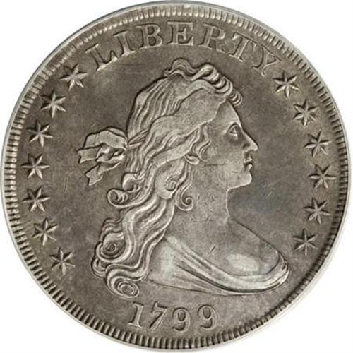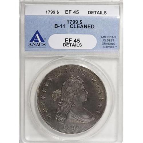 <B>1799 $1 7x6 Stars--Cleaned--ANACS. XF45 Details.</B></I> B-11, BB-161, R.3. The No Berries reverse die. Light hairlines are evident on each side, those on the obverse are covered with medium gray-brown toning while the reverse surface is light gray-silver color with traces of luster.<BR><BR><B>Coin Engraver:</B> Robert Scot<BR><BR><b>Shipping:</b> Coins & Currency (<a target="_blank" href="http://www.heritageauctions.com/common/shipping.php">view shipping information</a>)