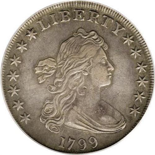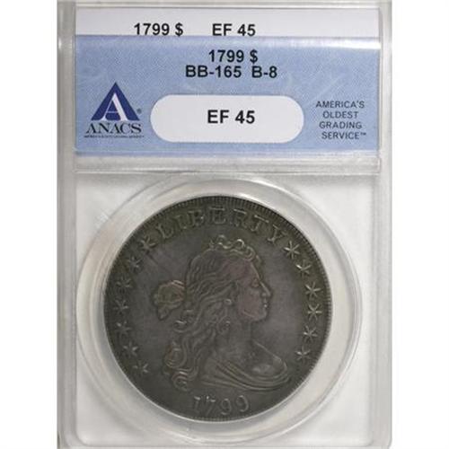<B>1799 $1 7x6 Stars XF45 ANACS.</B></I> B-8, BB-165, R.3. Liberty's shoulder curl and forehead show moderate wear, but the reverse is exquisitely detailed, as are the dentils and the most of Liberty's curls. Rich cream-gray toning embraces the impressively unblemished surfaces. Only thorough evaluation locates an unimportant reverse rim nick at 7:30.<BR><BR><B>Coin Engraver:</B> Robert Scot<BR><BR><b>Shipping:</b> Coins & Currency (<a target="_blank" href="http://www.heritageauctions.com/common/shipping.php">view shipping information</a>)
