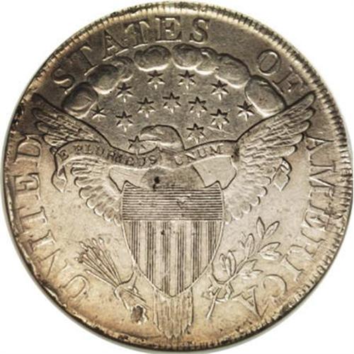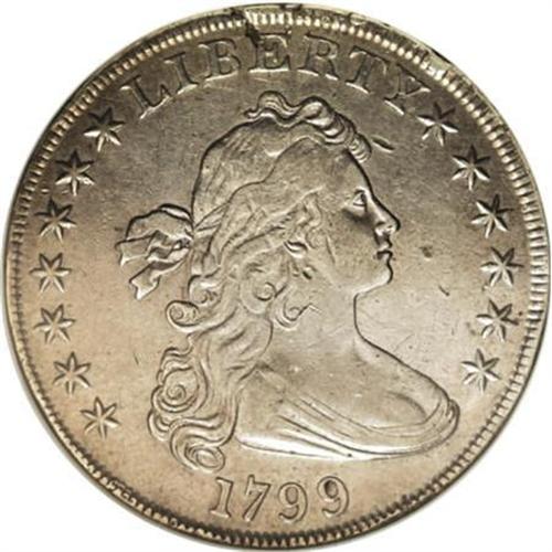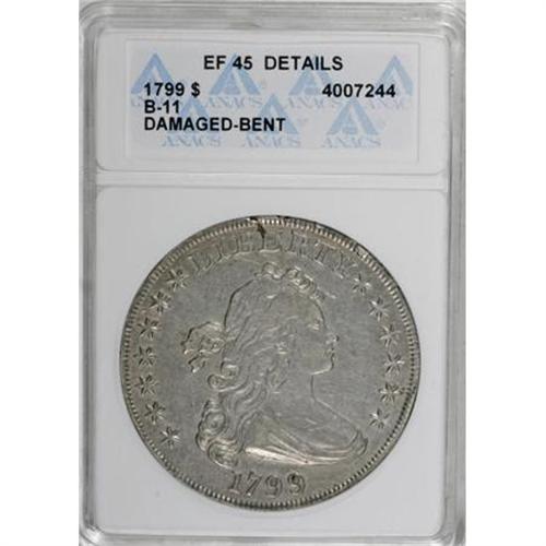 <B>1799 $1 7x6 Stars--Damaged, Bent--ANACS. XF45 Details.</B></I> B-11, BB-161, R.3. A ''No Berries'' variety, and further distinguished by a broken U in UNITED and a die crack past the D in UNITED. On the obverse, the base of the I in LIBERTY is slightly below the adjacent B. Some small punch marks are visible on each side, as are rim bruises. The bending does not appear to be all that severe. Nicely detailed, with light golden-gray patina.<BR><BR><B>Coin Engraver:</B> Robert Scot<BR><BR><b>Shipping:</b> Coins & Currency (<a target="_blank" href="http://www.heritageauctions.com/common/shipping.php">view shipping information</a>)