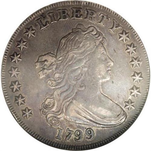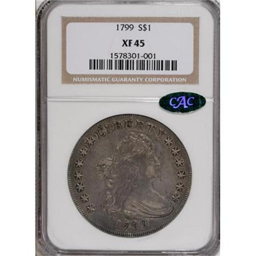 <B>1799 $1 7x6 Stars XF45 NGC. CAC.</B></I> B-14, BB-167, R.3. Sea-green, lilac, and gunmetal-gray envelop this richly detailed early dollar. Adjustment marks are limited to the eagle's shield and neck. Each side has a couple of minor edge abrasions, but the fields and devices are unblemished. Heraldic Eagle dollars remain enormously popular, particularly those with 18th century dates.<BR><BR><B>Coin Engraver:</B> Robert Scot<BR><BR><b>Shipping:</b> Coins & Currency (<a target="_blank" href="http://www.heritageauctions.com/common/shipping.php">view shipping information</a>)