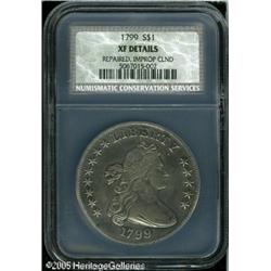 <B>1799<img border='0' src='http://www.heritagecoins.com/images/star.gif' width=10 height=10>$1 8X5 Stars XF Details, Repaired, Improperly Cleaned, NCS.</B></I> B-23, BB-159, R.2. The obverse fields appear to have been smoothed, and the unnaturally bright surfaces display fine hairlines from polishing. The design elements reveal relatively strong definition throughout. Lot:7329