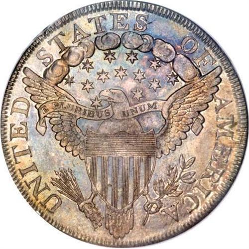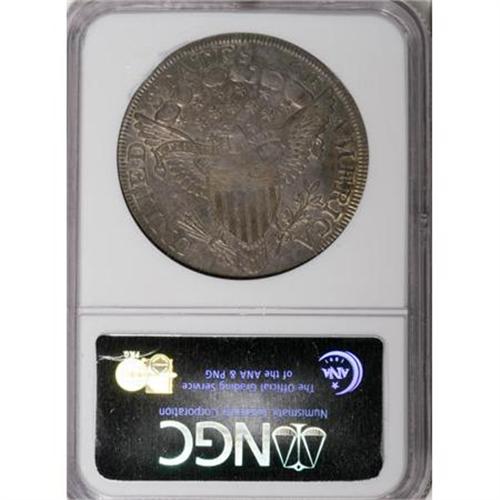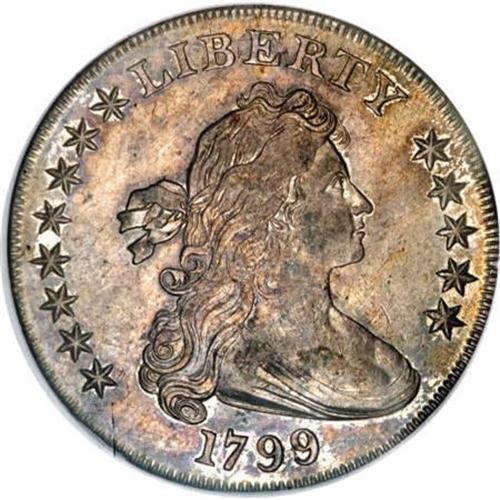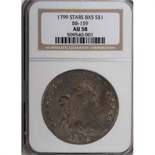 <B>1799 $1 8x5 Stars AU58 NGC.</B></I> B-23, BB-159, R.4. Die State II. This intermediate die state example has an intermittent die crack from the left top of E through the lower right curve of B and into the field below that letter. Although called a crack, it actually has the appearance of a series of tiny die chips.<BR> Although below the Condition Census for the variety, this is an exceptional example with nearly full satiny luster visible beneath light gold and sky blue toning. With eight stars crowded along the left obverse border, and only five to the right, the B-23 is a popular engraving error and a major <I>Guide Book</B></I> variety.<BR><I>From The Queller Family Collection of Silver Dollars.</B></I><BR><BR><b>Shipping:</b> Coins & Currency (<a target="_blank" href="http://www.heritageauctions.com/common/shipping.php">view shipping information</a>)