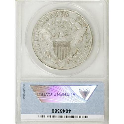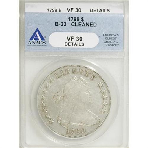 <B>1799 $1 8x5 Stars--Cleaned--ANACS. VF30 Details.</B></I> B-23, BB-159, R.4. B-23 is the sole 8x5 Stars variety, and is perhaps the most distinct variety of the date. This pearl-gray example has a few faint hairlines on the central reverse, but the subdued surfaces are only lightly abraded. Most letters in E PLURIBUS UNUM are bold.<BR><I>From The John Stimson, Sr. Collection, Part Two.</B></I><BR><BR><B>Coin Engraver:</B> Robert Scot<BR><BR><b>Shipping:</b> Coins & Currency (<a target="_blank" href="http://www.heritageauctions.com/common/shipping.php">view shipping information</a>)